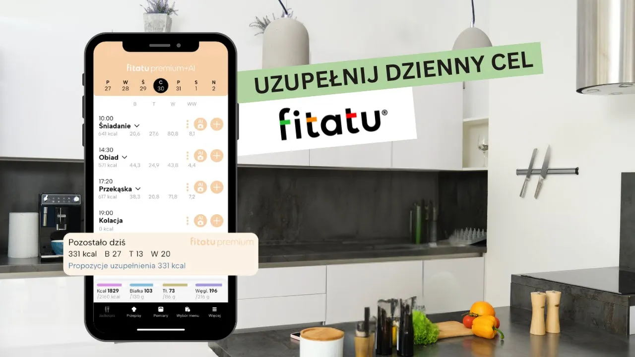 „Uzupełnij dzienny cel” to moduł, który jest widoczny na Twoim jadłospisie. Dowiesz się z niego, ile kalorii oraz makroskładników pozostało danego dnia do osiągnięcia limitu.